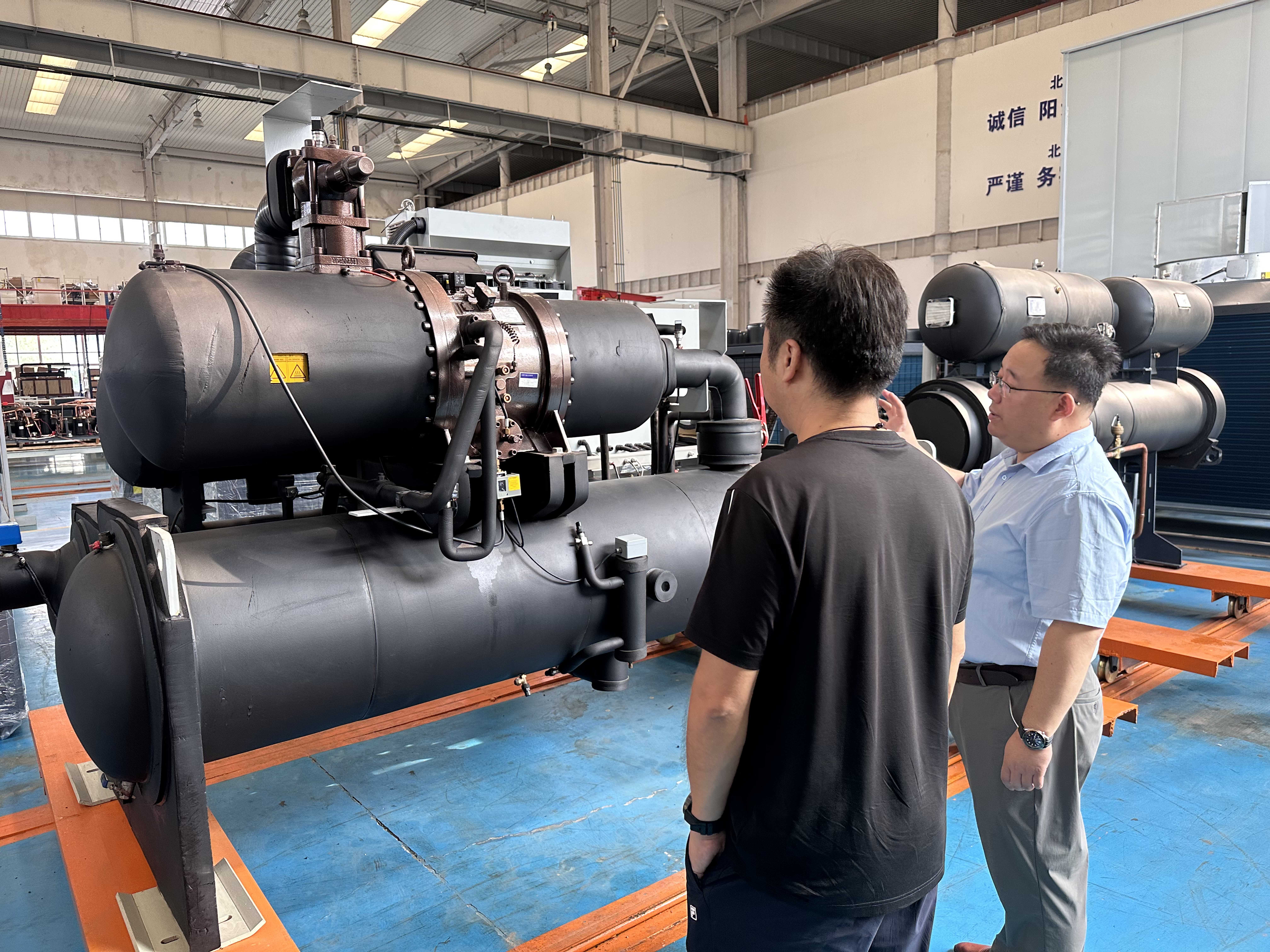 总经理王进杰带领大家共同参观了香蕉视频APP下载安装自主研发的国内首创大压比离心式热泵机组,机组设有单电机双轴伸驱动A,B压缩机头左右一体布置,可以协同工作,实现性能优化,离心机机组噪音测试低至80分贝,空气源热泵机组噪音低至64分贝,更加低震低噪。